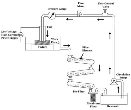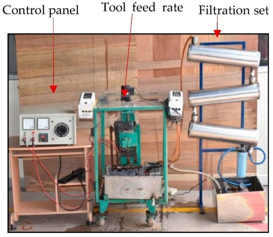 The experiments were carried out on the eco-friendly electrochemical machining (EECM) tool. The schematic diagram of the EECM tool is shown in Figure 1. EECM comprises a power supply system, electrolyte supply system, filtering system, tool feed mechanism, work holding and position system, control panel, frame, and housing. The electrolyte (e.g., NaCl aqueous solution) is allowed to flow at the rate between 1 L/min and 10 L/min through the inter-electrode gap (IEG) of 0.1–0.6 mm. The direct current (DC) potential (11–15 V) with a current density of 20–110 A/cm2 is applied across IEG between a cathodic copper tool and an anodic workpiece. At low current densities, the MRR is low [37]. The higher current density of 110 A/cm2 was used to attain high current efficiency. According to Faraday’s laws of electrolysis, the anodic dissolution rate of workpiece depends on the electrochemical properties of the workpiece metal, the electrolyte properties, and the power supply conditions. The tool is fed against the anodic workpiece, which is firmly fixed on the vice. The machining conditions of IEG, voltage (V), and current (C) are set in the control panel. The filtration system consists of layers of bio-absorbents compartments and membrane filter. A photograph of the indigenously developed EECM is shown in Figure 2. The tool’s diameter and electrolyte exit hole were 8 mm and 2 mm, respectively. The operating conditions of EECM are summarized in Table 2.