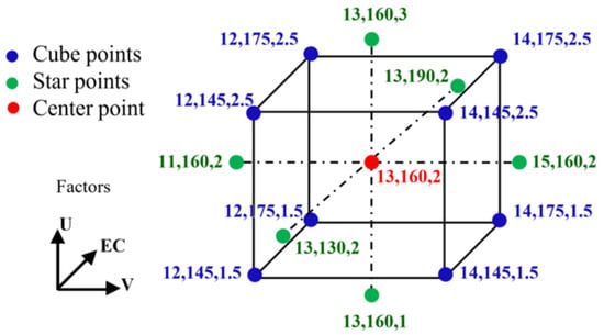 The IEG was set to 0.1 mm, and a current of 50 A was set in the DC rectifier. The machining was performed for 5 min. The central composite design (CCD) of the response surface methodology (RSM) was adopted with the help of Minitab-17 software for the process parameters, and its levels are shown in Table 3. In this work, 20 experimental tests were carried out with different parameter combinations as shown in Figure 3. According to the concept of CCD, the center point combination was repeated 5 more times during experimentation to reduce the pure error.