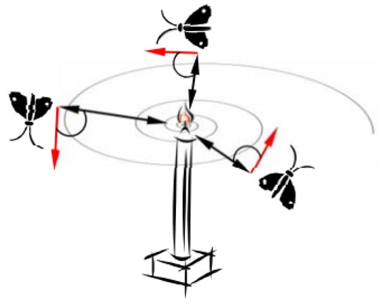 The moth-flame optimization (MFO) algorithm takes inspiration from the navigational mechanism (i.e., transverse orientation) of moths during night flights. The moth flies by maintaining a fixed angle relative to the moon. Since the moon is so far away from the moth, this mechanism assures the linear flight of moths. Although a lateral orientation is practical, moths are often trapped to repeatedly circle many close artificial or natural point light sources until they are exhausted. This behavior of moths is shown in Figure 6.