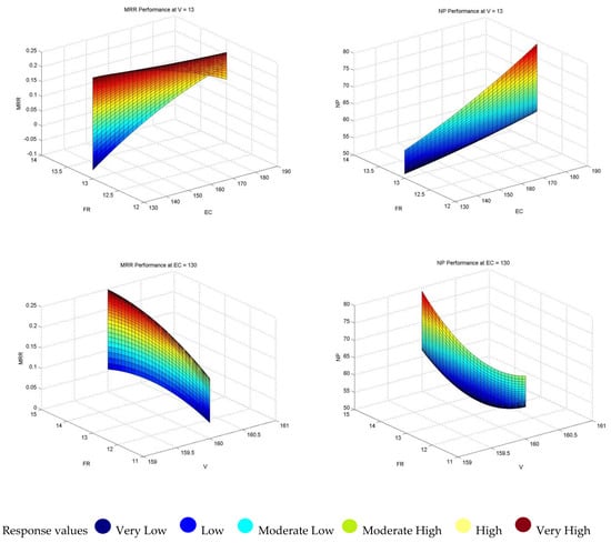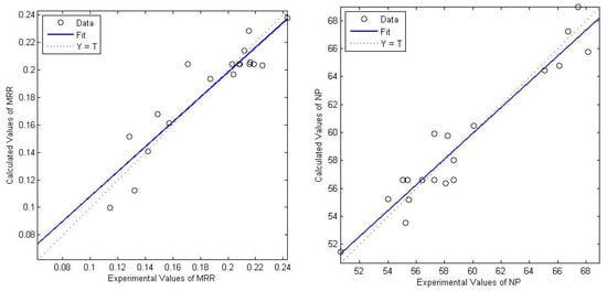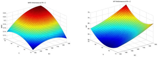 The model F-values in Table 6 indicate that the developed models were very significant. The two-way interaction terms such as EC*V, EC*EC, and V*FR for the MRR and NP models were insignificant when the values of “Prob > F” were greater than 0.05. The terms V*V and EC*FR for the MRR and NP models, respectively, were not significant, but the coefficient of determination values for both models were good, as shown in Table 7. The normal probability curves in Figure 7 confirm the adequacy of the model equations. The high coefficient of determination values (R2 = 90.34% for the MRR and R2 = 92.29% for the NP) for both responses confirm its adequacy for optimization study.