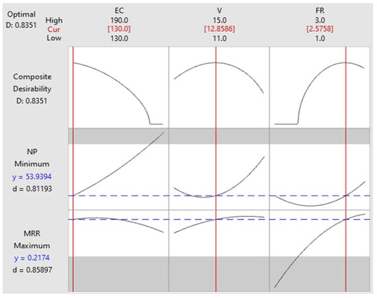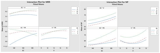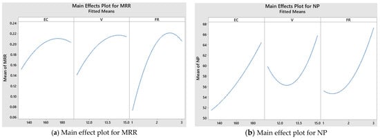 Figure 9 represents the main effect plots of the MRR and NP responses using MiniTab17 software. It was noticed that the electrolyte flow rate and electrolyte concentration were the influencing factors for the MRR and NP, respectively. Variations in the voltage also produced significant results in the responses.