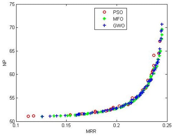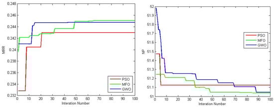 The PSO implementation is shown in Figure 14. The efficiency of these algorithms is compared in the convergence plot of Figure 15. In maximization of the MRR, the MFO convergence plot was attained after the 60th iteration, while GWO and PSO performed better. In minimization of the NP, PSO converged well before MFO and GWO.