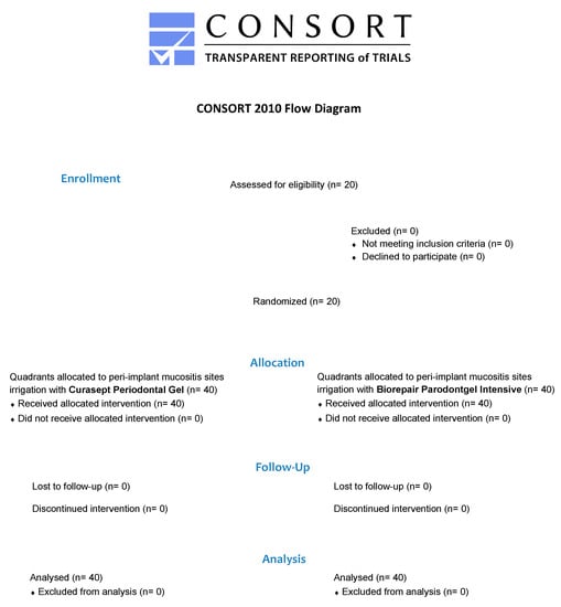 - Butera, A.; Gallo, S.; Pascadopoli, M.; Luraghi, G.; Scribante, A. Ozonized Water Administration in Peri-Implant Mucositis Sites: A Randomized Clinical Trial. Appl. Sci. 2021, 11, 7812. [Google Scholar] [CrossRef]