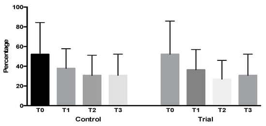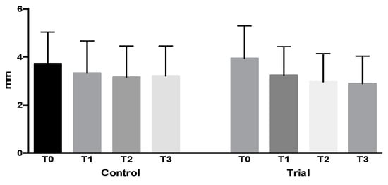 After six months, PPD measurements showed a significant decrease for either product (p < 0.05). Regarding differences in the probiotic and chlorhexidine group, a statistically significant decrease was seen in the BPI at T1 and T2, whereas for the CHX it was evaluated at T1 (p < 0.05). No significant difference between the two treatments applied was found (p > 0.05); however, considering that at T0 the PPD value was higher in the trial group, the improvement at T3 in the trial group was higher than in the control group (Table 4 and Figure 2).