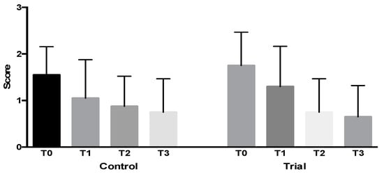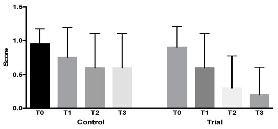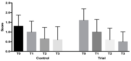 For the bleeding score, a more significant reduction was evidenced at T3 than at T0 (p < 0.05). This outcome was greater after probiotic application, as a significant decrease is seen already at T1, whereas after CHX application is seen only at T2 (p < 0.05). There were no significantly observed differences between BPI and CHX at any stage of the present study (p > 0.05) (Table 7 and Figure 5).