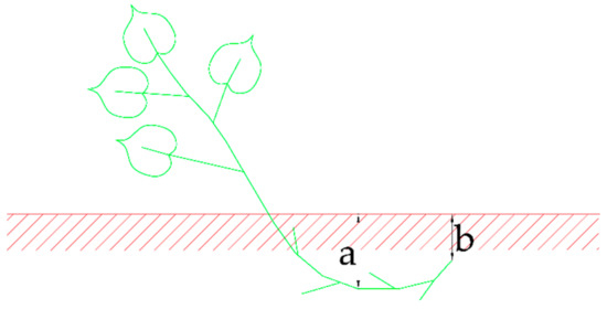 The schematic diagram of boat-bottom-shaped insertion method transplanting is shown in Figure 1. The boat-bottom-shaped insertion method means that the sweet potato plants curve downward in the soil and all the leaves show above the ridge, and the sweet potato stalk in the soil is boat-bottom-shaped. The agronomic requirements for boat-bottom-shaped sweet potato transplanting are as follows: (a) 40–60 mm depth of the seedling stalk’s middle part immersed in soil, (b) 20–30 mm depth of the seedling stalk’s root end immersed in soil, and (c) 180–220 mm length of the stalk immersed in soil [23].