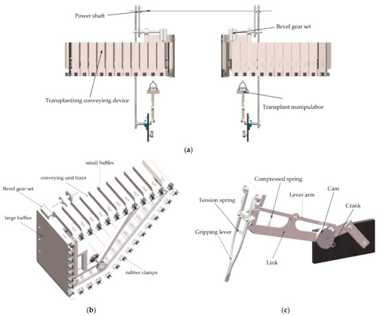 Working diagram of the transplanting device. (a) Top view of transplanting device, (b) transplanting conveyor device, and (c) transplanting manipulator.