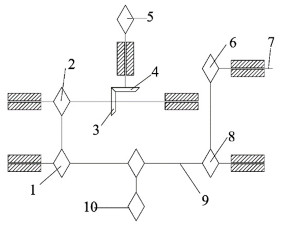 Drive system schematic: the sprocket 1 outputs power to the transplanting conveying device 2; the sprocket is linked with the main power shaft (3 and 4); 5 is the bevel gear; 6 is the power gear of the transplanting conveying device; 7 is the power gear of the crank; 8 is the power shaft linked with the crank; 9 represents the sprocket outputting power to the transplanting manipulator; and 10 is the main power shaft of the ground wheel.