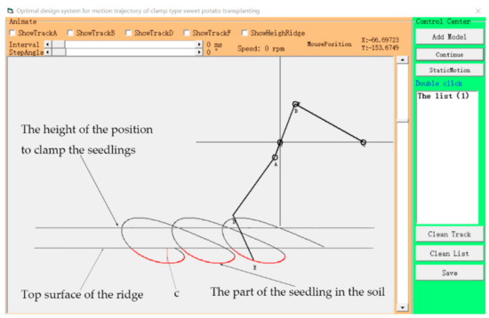 As shown in Figure 6, according to the obtained trajectory shape, combined with the agronomic requirements of the boat-bottom-shaped insertion method, we can select the appropriate ridge top position; the ratio of the planting depth c to the actual planting depth a in the trajectory is used as a reference to restore the four bars’ actual value.