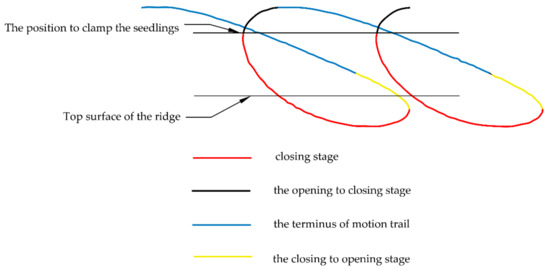 After calculating the transplanting manipulator’s movement trajectory, the vertical heights of the three key points are used to confirm the movement strokes at various phases of the transplanting manipulator, as shown in Figure 7. The three key points include the location of clamping seedlings, the a value, and the b value.