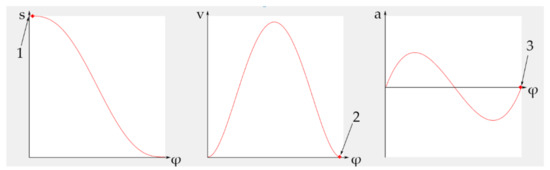 The displacement, velocity, and acceleration curves of the follower when the cam is working in the return zone. (1) The descending height h of the follower in the return zone (2). The movement speed of the follower at the end of the return zone (3). The movement acceleration of the follower at the end of the return zone.