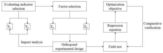 Figure 9 illustrates the test procedure. The evaluation indexes and factors are first chosen in accordance with the analysis and relevant requirements. Then, using quadratic regression or orthogonal combination design tests, the field trial is performed to generate the regression equation corresponding to the evaluation index. To optimize the indexes and influencing factors, the regression equation is used. Finally, the results of the field testing are compared to the optimized outcome.