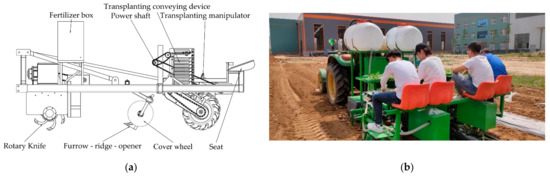 - Hu, L.; Wang, B.; Wang, G.; Yu, Z.; You, Z.; Hu, Z.; Wang, B.; Gao, X. Design and experiment of type 2ZGF-2 duplex sweet potato transplanter. Int. J. Agric. Biol. Eng. 2016, 32, 8–16. [Google Scholar]