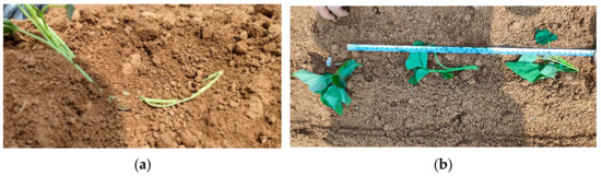 In the measurement area, at least 300 sweet potato seedlings were tested in each group. The qualified rates of node depth in the seedling middle (QRNDSM), the qualified rates of seedling root depth (QRSRD), and the qualified rates of stalk length into the soil (QRSLS) were measured. The test method complies with the Group Standard of Sweet Potato Multi-Transplanter (T/CAAMM 52-2020). The QRNDSM is calculated according to Equation (16), the QRSRD is calculated according to Equation (17), and the QRSLS is calculated according to Equation (18).