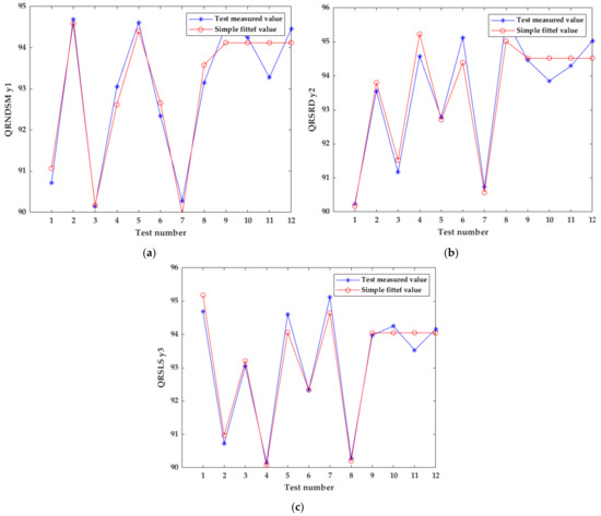 Table 7 describes the analysis of regression. The R values of QRNDSM y1, QRSRD y2, and QRSLS y3 are equal to 0.9728, 0.9672, and 0.9850, respectively, suggesting that the regression model’s experimental variables and test indicators have an intense linear relationship. For QRNDSM y1, QRSRD y2, and QRSLS y3, the coefficients of determination R2 are 0.9464, 0.9356, and 0.9703, respectively, indicating a high degree of fit for the regression model. To avoid the confine from determination coefficient R2, an adjusted coefficient of determination Adj R2 is acquired. According to the results, the adjusted determination coefficient for the QRNDSM qualified rate y1 is 0.9494, showing that the model could explain 94.96% of the variation in QRNDSM y1. Similarly, the adjusted determination coefficient of the QRSRD y2 is 0.9391, which shows that the model could explain 93.91% of the variation in QRSRD y2. The adjusted determination coefficient of the QRSLS y3 is 0.9724, showing that the model could explain 97.24% of the variation in QRSLS y3. The statistic of Durbin–Watson meets the requirements of 1 < d < 3 simultaneously, indicating that the test data are highly reliable.