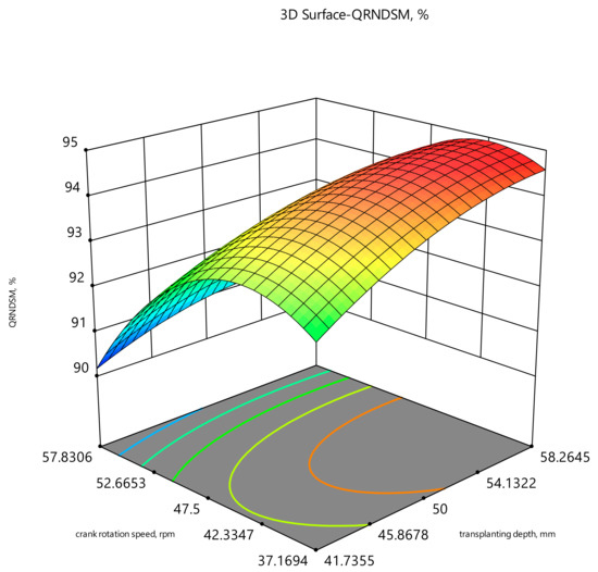 It can be shown from Equation (19) that the crank rotation speed has more influence on QRNDSM than transplanting depth. After sorting, the true QRNDSM regression equation was found by Table 2: