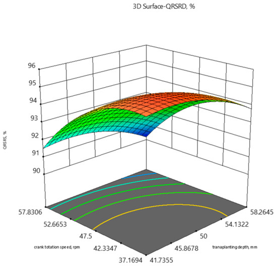 As shown in Figure 14, under the condition of stable transplanting depth, the crank rotation speed has a significant effect on QRSRD, and the QRSRD decreases with the increase in crank rotation speed. Under the condition of stable crank rotation speed, the transplanting depth has a significant effect on QRSRD, and the QRSRD diminishes as the depth of the transplantation is increased. The reason for this phenomenon is that the position where the seedlings are clamped at the stalk about 2 cm away from the roots of the seedlings, during the upward movement of seedlings’ roots, downward resistance from the soil will be encountered. According to the characteristics of the fluid, the faster the movement speed, the greater the resistance of the soil, which causes the seedling roots’ actual transplanting depth to be less than the theoretical depth. The above explanation also explains why the QRSRD decreases with the increase in transplanting depth. In order to ensure that QRSRD has a higher qualified rate, the transplanting depth can be selected between 40 and 55 mm, and the crank rotation speed can be selected between 35 and 47.5 rpm.