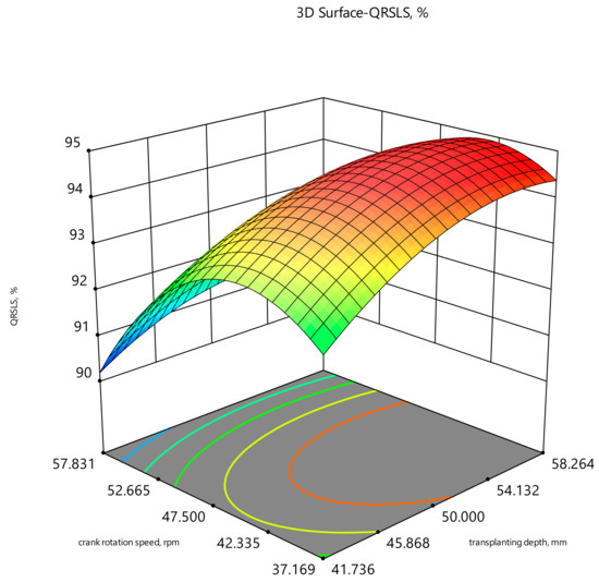 As shown in Figure 15, (1) under the condition of stable transplanting depth, the crank rotation speed has a certain effect on QRSLS, and the QRSLS decreases with the increase in crank rotation speed, and (2) under the condition of stable crank rotation speed, the transplanting depth has a significant effect on QRSLS, and the QRSLS increases with the increase in the transplanting depth. The reason for phenomenon (1) is that the deeper the transplanting depth, the longer the seedling stalk’s length is buried in the soil, which is the same as the reason analyzed in Section 4.3.1. The reason for phenomenon (2) is that when the transplanting speed accelerated, the degree of the soil’s disturbance above the seedlings by the transplanting manipulator increased, causing the seedling stalks to rebound upward under the action of its elastic force, which is the same as the reason analyzed in Section 4.3.1.