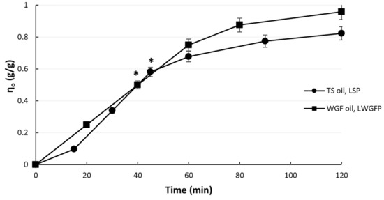 Tomato seed and wheat germ flour oil extraction yields () vs. extraction time, evaluated during trials #6 and #7 performed with layered configurations (LSP and LWGFP, respectively). p > 0.05 for all the points marked with asterisks, *.