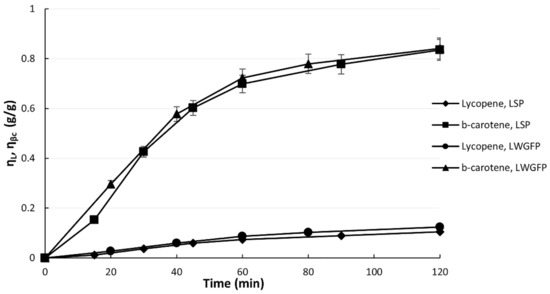 Lycopene and β-carotene extraction yield (ηL and ) vs. extraction time, evaluated during trials #6 and #7 performed with layered configurations (LSP and LWGFP, respectively). For each layered configuration, non-significant differences (p > 0.05) between the experimental points were found.
