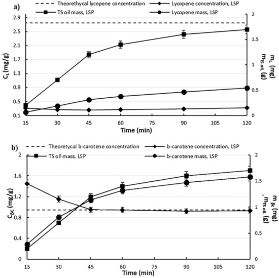 Lycopene concentration (Figure 4a) in TS oil remained approximately constant (0.3 mg/g) during the entire extraction process and resulted to be much lower than the theoretical concentration achievable (2.78 mg/g). Moreover, during the first phase of extraction, the β-carotene concentration in TS oil was higher than the theoretical value of 0.95 mg/g, which was reached after 45 min and remained approximately constant until the end of the process. In fact, in the first process stage of the process, the amount of β-carotene initially recovered was higher than the oil mass simultaneously extracted, leading to a more concentrated tomato seed oil. Conversely, in the last extraction period, the trend of oil and β-carotene mass curves was reversed, and a lowering of the concentration was observed, due to the greater quantity of oil extracted compared to that of β-carotene.