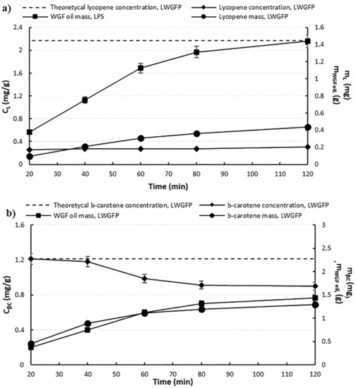 On the other hand, β-carotene concentration in WFG oil was close to the theoretical value (1.21 mg/g) during the first 40 min of process and decreased during the second extraction phase, when the extracted β-carotene mass diminished with respect to the oil amount simultaneously recovered (Figure 5b).