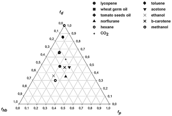 Fractional Hansen Parameters, fp, fd, and fhb, were calculated for lycopene, β-carotene, tomato seed oil, and wheat germ oil. They are represented in the Hansen ternary plot in Figure 6 and are compared with the fractional parameters related to other common organic solvents [38].