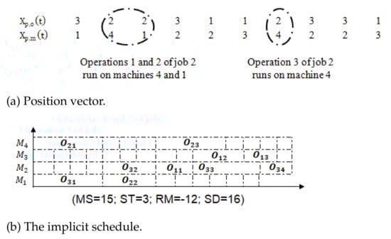 A position vector of integer elements in each particle p (O is the set of operations) where the initial items, denoted , creates one operation scheduling order. The operation referred to by takes precedence over the operation referred to by . The elements in the second element define an operations-to-machines mapping. An example of and is shown in Figure 2a. According to , the first operation of is scheduled first, followed by the first and second operations of , the second operation of , and so on.