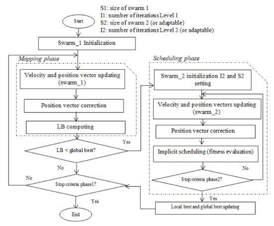 Flowchart of the two-level particle swarm optimizatiom—flexible job shop scheduling problem (PSO-FJSP).