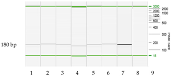 Gel electrophoresis of RT-PCR-amplified RNA analyzed in QIAxcel System, Qiagen. Lane 1–6, positive samples yielding amplicons of the expected size (180 bp); lane 7, positive control; lane 8, negative control; lane 9 DNA ladder.