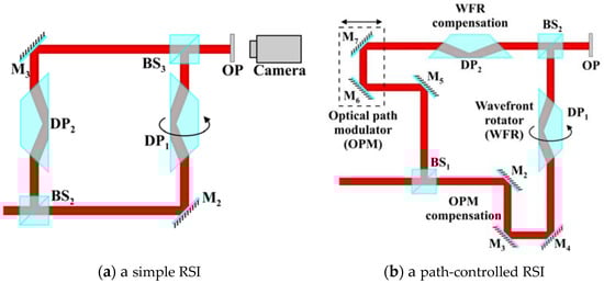 (a) An RSI implemented in a Mach–Zehnder configuration with two Dove prisms. A Dove prism DP that is rotated by an angle about the optical axis introduces the wavefront shear in the RSI. The symbols are interpreted as follows: M, mirror; BS, beam splitter; and OP, observation plane. (b) Conceptual design of an RSI with an electro-opto-mechanical delay module in one arm and a compensation module in the other arm. A computer-controlled two-mirror assembly in each arm is used to precisely adjust the paths in both interferometer arms for increased wavefront coherence.