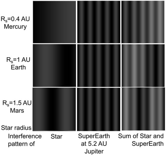 An illustration of the effect of the distance of the star center from the origin of the primed coordinate system (see Figure 1). The text in column 1 presents the displacement of the center of the red giant star. The star centers are located at 0.4 AU, 1 AU and 1.5 AU distances from the coordinate origin. The second column features the interference patterns of the star with itself for three star-center positions. The third column displays the interference pattern of the Super Earth planet with itself, for the specific case of the Jupiter distance of 5.2 AU. The fourth column features the sum of the interference patterns of the red-giant star and the Super Earth planet. The planet interference pattern dominates the sum of the planet and the star incidances.