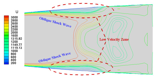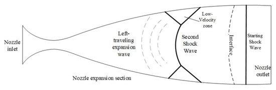 6]. The second shock wave interacts with the boundary layer, bending inward and forming a local low-velocity zone and oblique shock wave on the wall. Only when the low-velocity zone flows out of the nozzle can the flow field at the nozzle outlet be stable, as shown in
