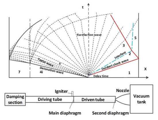 When the test gas enters the nozzle, the nozzle starts, and an incident shock wave is then generated in the nozzle; that is, the starting shock wave as a result of the much higher reservoir region pressure than the initial pressure in the nozzle. The high-temperature and high-pressure gas in the reservoir region accelerates through expansion in the nozzle and produces a series of left-traveling expansion waves in the expansion section. As the cross-sectional area of the nozzle expansion section increases, the starting shock wave is continuously attenuated, resulting in the left-traveling compression waves. A series of compression waves then coalesce into a shock wave, forming the second shock wave. The second shock wave is a left-traveling wave, but due to the high velocity of the gas in the expansion section, it is carried to the nozzle outlet by the airflow [