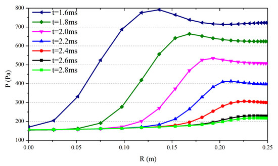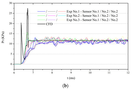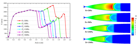 The movement of gas in the nozzle can be regarded as the movement of gas in the shock tube with a variable cross-section. For a given reservoir region pressure, it can be seen from theoretical relation Equation (9) that the Mach number of the moving shock wave can be increased by reducing the initial pressure (Pe).