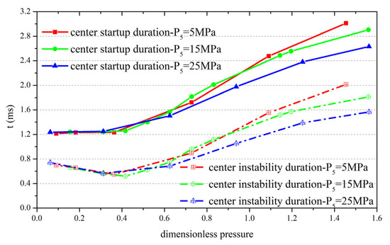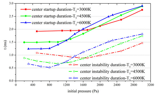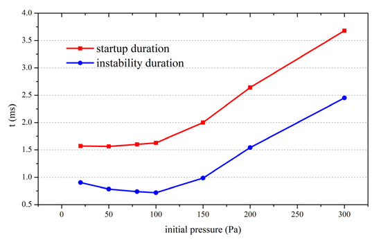 When the initial pressure is less than 100 Pa, the center startup duration remains unchanged at about 1.6 ms. In this stage, the center instability duration decreases gradually with an increase in the initial pressure. However, when the initial pressure is greater than 100 Pa, the center startup duration and instability duration begin to increase. As can be seen in