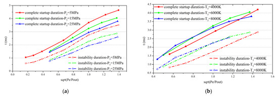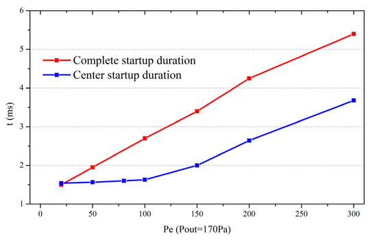 In order to analyze the influence of the initial pressure on the nozzle startup, the duration of the nozzle starting process was calculated under the conditions of