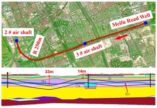 The airport connecting line (west section) project of the Shanghai rail transit city line is the trunk line connecting Shanghai’s international airports. The tunnel runs east–west as a whole, with a total length of about 68.6 km, including an underground section of 56.7 km. The maximum overburden of the tunnel top is 33 m, the minimum is 14 m, the minimum radius is R520, the maximum longitudinal slope is 2%, and the length below the radius of R600 is about 660 m. The construction sequence of the tunnel is shown by the red arrow in Figure 1. The main crossing strata are ④ Silt clay, ⑤1 silty clay, ⑥1 silty clay, and ⑦1 silty sand mixed with silty clay. The specific soil layer structure is shown in Figure 1.