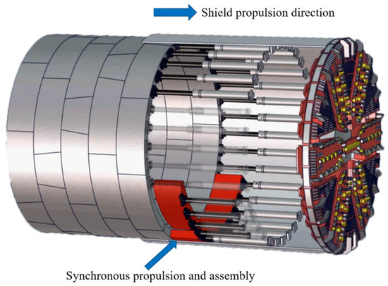 Synchronous propulsion and assembly method is realized by intelligently controlling the pressure of the shield propelling cylinder. The difference with respect to the traditional shield is that the shield machine of the synchronous propulsion and assembly method lengthens the length of the jacking cylinder and realizes the synchronous assembly of some segments by using the surplus of the stroke of the push cylinder. The construction efficiency of the synchronous propulsion and assembly method is directly proportional to the remaining distance of the jack, which can shorten the construction time of each ring segment by 60% at most. The shield machine used in this project has a margin time for the assembly of three segments. Therefore, the focus of this paper is also on the stress of the three segments in the synchronous propulsion and assembly mode. The specific operation methods of the synchronous propulsion and assembly method are as follows: