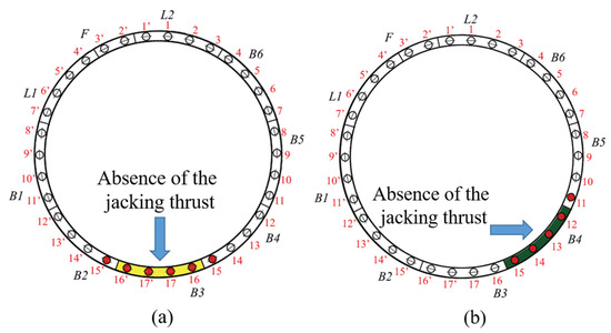 Steps of jack jacking in synchronous propulsion and assembly mode: (a) The working condition of the jack when the first segment is assembled; (b) The working condition of the jack when the second segment is assembled.