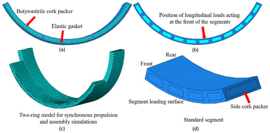 Geometry and mesh of finite element models: (a) The location of the butyronitrile cork packer and elastic gasket; (b) Position of longitudinal loads acting; (c) Mesh of standard segments; (d) Description of segment orientation.