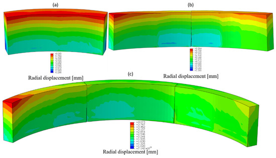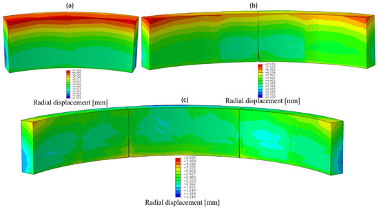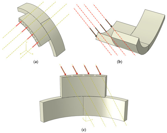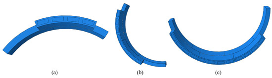 The modeling order of the model changes as the segments are assembled. The assembly sequence of segments is as shown in Figure 6. Taking the third segment assembly model as an example, displacement constraints are first imposed on both sides of the looped segment. The back push surface and the global gravity is activated according to the working conditions to initialize the segment’s positional information. Next, the thrust of the jack on the face of the two segments that have been assembled is activated. Before the radial or tangential component force of the jack is activated, a certain longitudinal thrust is applied to form a certain contact between the gasket and the surface of the ring-shaped segment to reduce the relative slip. To maintain the boundary conditions of the ring segment, the radial or tangential component force of the jack can be added as required. Finally, the jack thrust and error component of the third segment are activated, and the component force is consistent with that of the other two segments. By adjusting the component force of the jack accordingly, the response of the segment under different assembly errors is simulated.