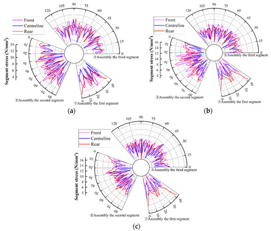 Taking the free side edge of the assembled segment as the starting point, according to the angle, it can be seen that the stress of the front, the rear, and the centreline of the segment at different assembly stages presents different stress distributions (Figure 9a). When the first segment is assembled, the stress of the segment is mainly concentrated at the front and the rear of the segment and the maximum stress is 13 N/mm2. When the segment is at the top, the segment has an obvious tendency to rotate inward, so the stress on the rear of the segment is relatively large. In particular, the stress on both sides of the rear increases rapidly. The main reason is that when the segment rotates, the rotation axis of the segment will autonomously choose to rotate along the edges on both sides of the segment. When the second segment is assembled, one side of the segment is supported by the assembled segment, so the stress at the rear of the segment is significantly reduced. At this time, the transmission of the stress of the segment is affected, and the stress at the front increases slightly. When the third segment is assembled, at least one side of all segments is supported, the stress distribution of segments is relatively uniform, and the overall stress is distributed within 3.5–10.5 N/mm2. The inward rotation of segments is improved. When the third segment is assembled, the middle segment will be squeezed a little, so the stress will surge to a certain extent at the rear and centreline of the segment.