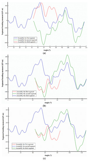 At this time, the bending moment of the segment is shown in Figure 10c. Compared with assembly of the lateral segment, when the first segment is assembled, the bending moment of the segment is slightly reduced. Under the smaller deflection, the angle formed between the segments is smaller, and the segment is less biased. After the second segment is assembled, since the newly assembled segment has a higher degree of freedom, the segment will deflect to a certain extent. At this time, under the action of gravity, the segment tends to bend outward, and the bending moment is slightly increased. When the synchronous propulsion and assembly mode is applied, the final bending moments of the segments in different positions are basically the same after the three segments are assembled. During the segment assembly process, as the segment’s stability increases gradually, the influence of gravity on the segment will gradually decrease. It is necessary to focus on the possible damage to the segment when one or two segments are assembled and the segment has a large degree of freedom.