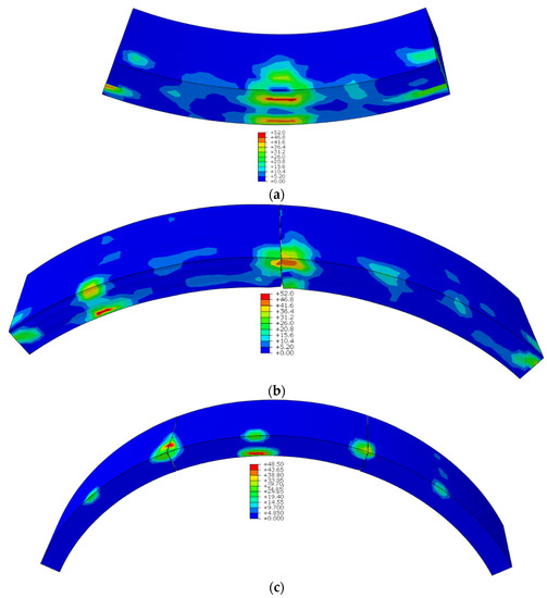 Damage to segment in the presence of outward deflection when the asymmetric error angle is 1.4°: (a) first segment assembly (%); (b) second segment assembly (%); (c) third segment assembly (%). (Take the segment at the bottom as an example.)