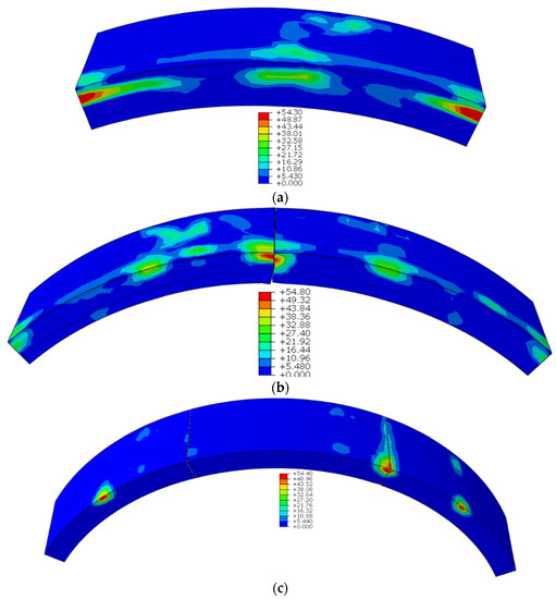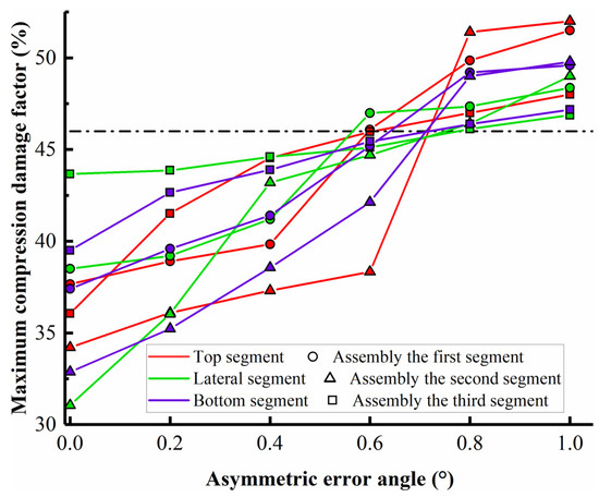 In the synchronous propulsion and assembly mode, the damage possibility and severity of the segment under the inward radial deflection error are evaluated by the compression damage factor. All simulations have reached the damage limit, and the maximum compression damage factor can reach 52%, as shown in Figure 13 and Figure 14. The damage factor of 46% is marked by the dot line, so that the damage angle of the segment can be obtained intuitively. No matter where the initial segment is, the compression damage factor will form a certain mutation after a gentle rise to a certain deflection angle, which is especially obvious in the early stage of segment assembly. On the contrary, when the third segment is assembled, the compression damage factor of the segment will rise slowly and reach a certain limit. Compared with the initial position of the segment at the top and bottom, the effect of inward radial deflection on the lateral segment is smaller, and the damage growth of the segment is slower. When the segment reaches 1° deflection, the maximum damage to the segment is also smaller. The tensile damage factor of the segment undergoes little change in different positions and during the assembly process, and the peak value is 91.81%. The main tensile damage to the segment occurs at the symmetrical center of the jack, which is mainly caused by the transverse tensile stress caused by the thrust of the jack [39,40].