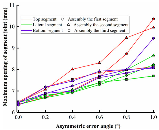 During assembly, the outer joint width of the segment will gradually increase with the maximum inward deflection of the segment. When the initial segment is at the top, the maximum joint of the segment is 10.44 mm, as shown in Figure 15. Similar to the changing trend in the compression damage factor, when the segment damage error changes abruptly, the maximum joint width of the segment increases sharply. The increase of the joint width means that the segment has a higher possibility of damage, which can be referred to as one of the most important sources of evidence when judging the quality of segment assembly in practical engineering. At the same time, the larger joint width will reduce the sealing performance of the gasket [41,42]. While the joint width of the top segment will undergo a larger increase with greater assembly error, the segments at the other positions will gradually tend to slow down. Obviously, under the action of the larger jack, the joints of the segments will not grow all the time and will gradually stabilize when the error reaches a certain level.