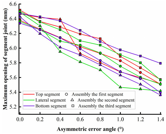 The maximum opening of the segment increases with the increase of the lateral deflection, as shown in Figure 21. When the segment is not assembled, the growth rate is much smaller than that of the radial deflection, and the maximum is only 9.9 mm. The joint of the segment is asymmetric, and the opening of the seam is affected by the direction of inclination. When the segment is on the side, the lateral deflection error of the segment will cause the segment to have a larger seam opening. This makes the segment more likely to be squeezed, and the larger seam quality will affect subsequent segment assembly.