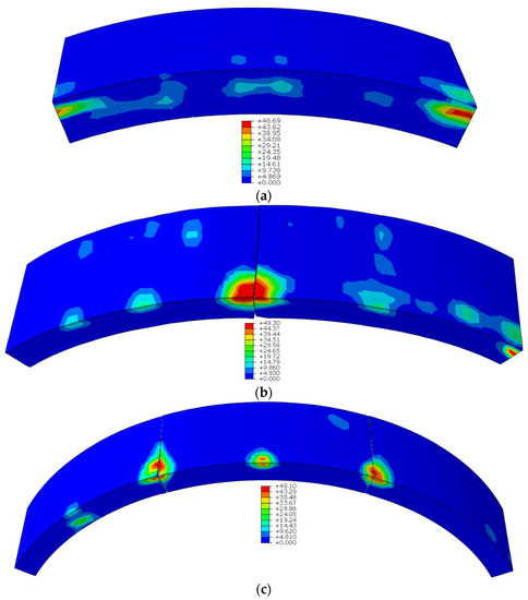 In the synchronous propulsion and assembly mode, the normal assembly of the segment will cause the segment to exhibit radial deflection, and the outward radial deflection error of the segment can reduce the possibility of segment damage to a certain extent. When a segment is deflected radially outward, the stress concentration effect on the packer is reduced, so the compression damage factor of the segment will not change abruptly. With the increase of the error, the compression damage factor increases with a more moderate trend. The maximum damage to the segment is concentrated on both sides of the middle segment, mainly showing the extrusion damage of the two sides and the compression damage of the segment gasket (Figure 16 and Table 5). When the initial segment is at the bottom, the outward radial deflection has the greatest influence on the damage to the segment. When the deflection is 0.41°, the segment will be damaged, as shown in Figure 17. The main reason for this is that the newly assembled segment is more prone to outward deflection when it is at the bottom than other initial positions. There are no other supports between the segment rings to provide additional support when radially deflected outwards, so the sides of the gasket are more prone to damage. When outward deflection occurs, the maximum tensile damage factor of the segment is 92.54%. Since the thrust is unchanged, the tensile damage of the segment is not greatly affected.