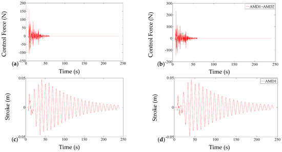 The AMD parameters of the systems without time delays, (a) the forces of System1, (b) the total forces of System2, (c) the strokes of System1, (d) the strokes to AMD1 of System2.